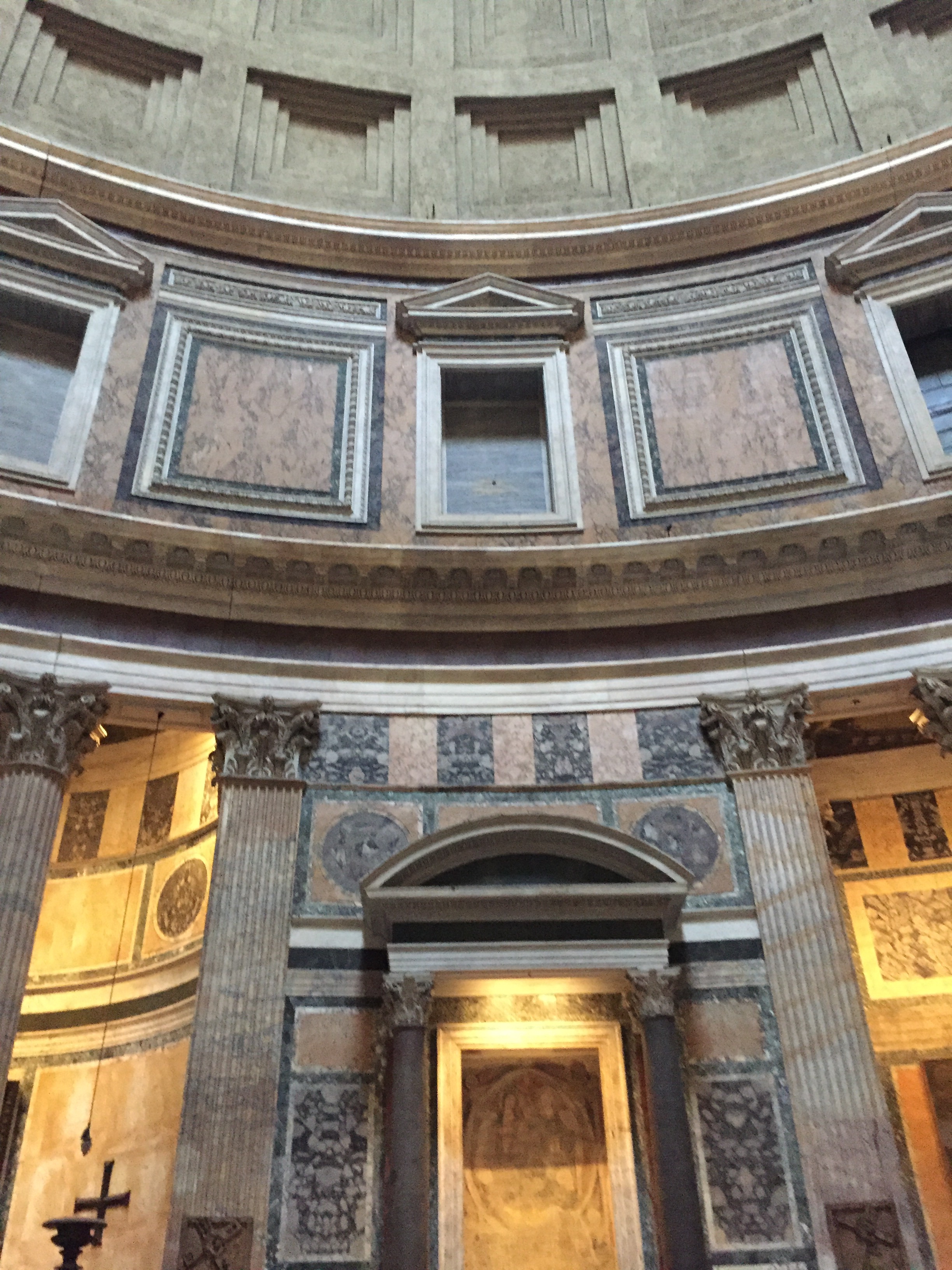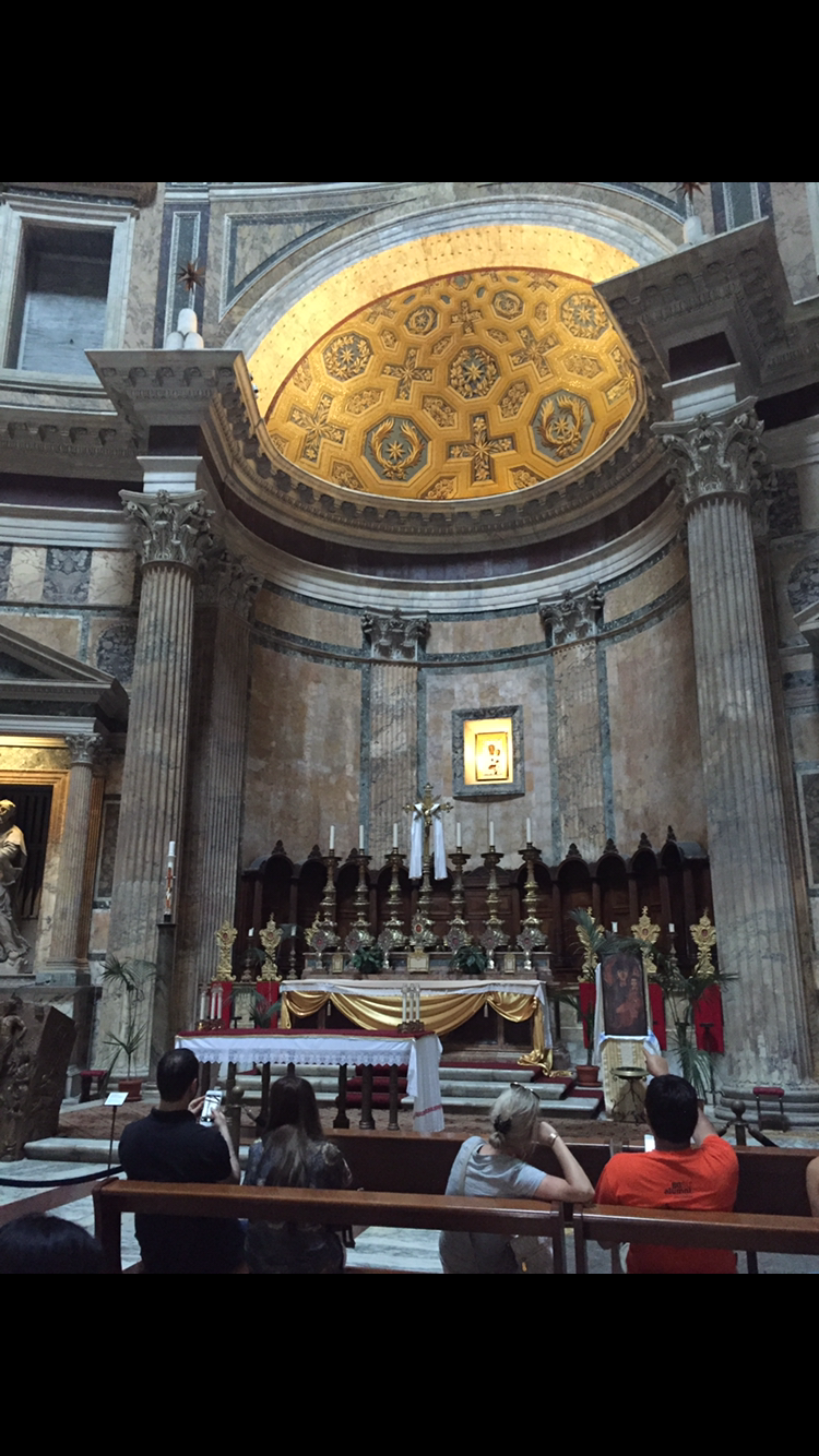 Built by the Emperor Hadrian, the Pantheon had a highly atypical design for its era. Unlike the typical, squarish Roman temples, the Pantheon (so named because it was dedicated to the entire pantheon of Roman deities) consists mainly of a large, circular room with niches set in the walls. An round opening, or “oculus,” lets sunlight into the room through the center of the domed ceiling. Yes, a staffer assured us, rain does in fact pour through the roof. This opening makes up for the lack of windows elsewhere in the temple.