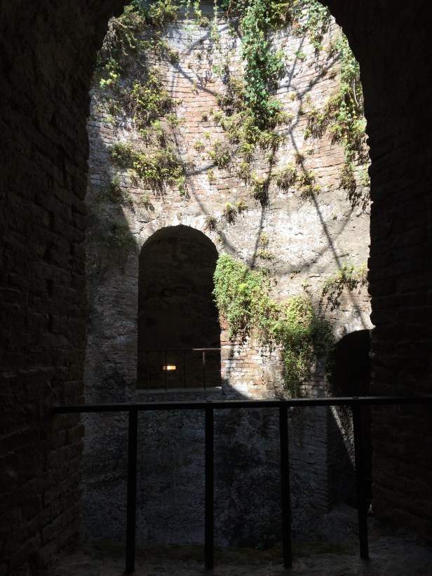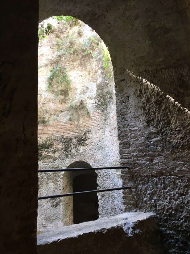 The 174-foot-deep well is accessed via two winding ramps nested inside each other. The idea behind this was that donkeys carrying water containers could walk down one ramp, then back up the other. A walkway crosses the base of the well connecting the two ramps. Rows of vaulted stone windows on the ramps open up into a central open column, providing light and ventilation.